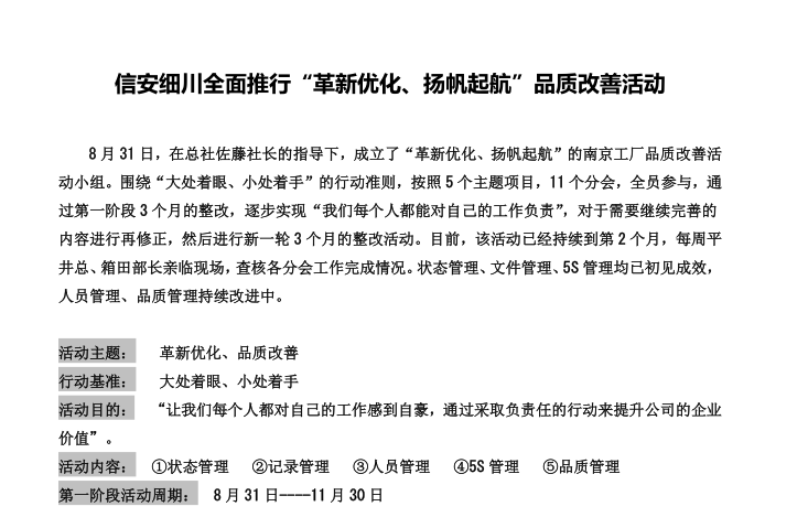信安細(xì)川全面推行“革新優(yōu)化、揚帆起航”質(zhì)量改善活動