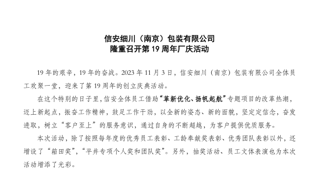 信安細(xì)川(南京)包裝有限公司隆重召開(kāi)19周年廠(chǎng)慶活動(dòng)